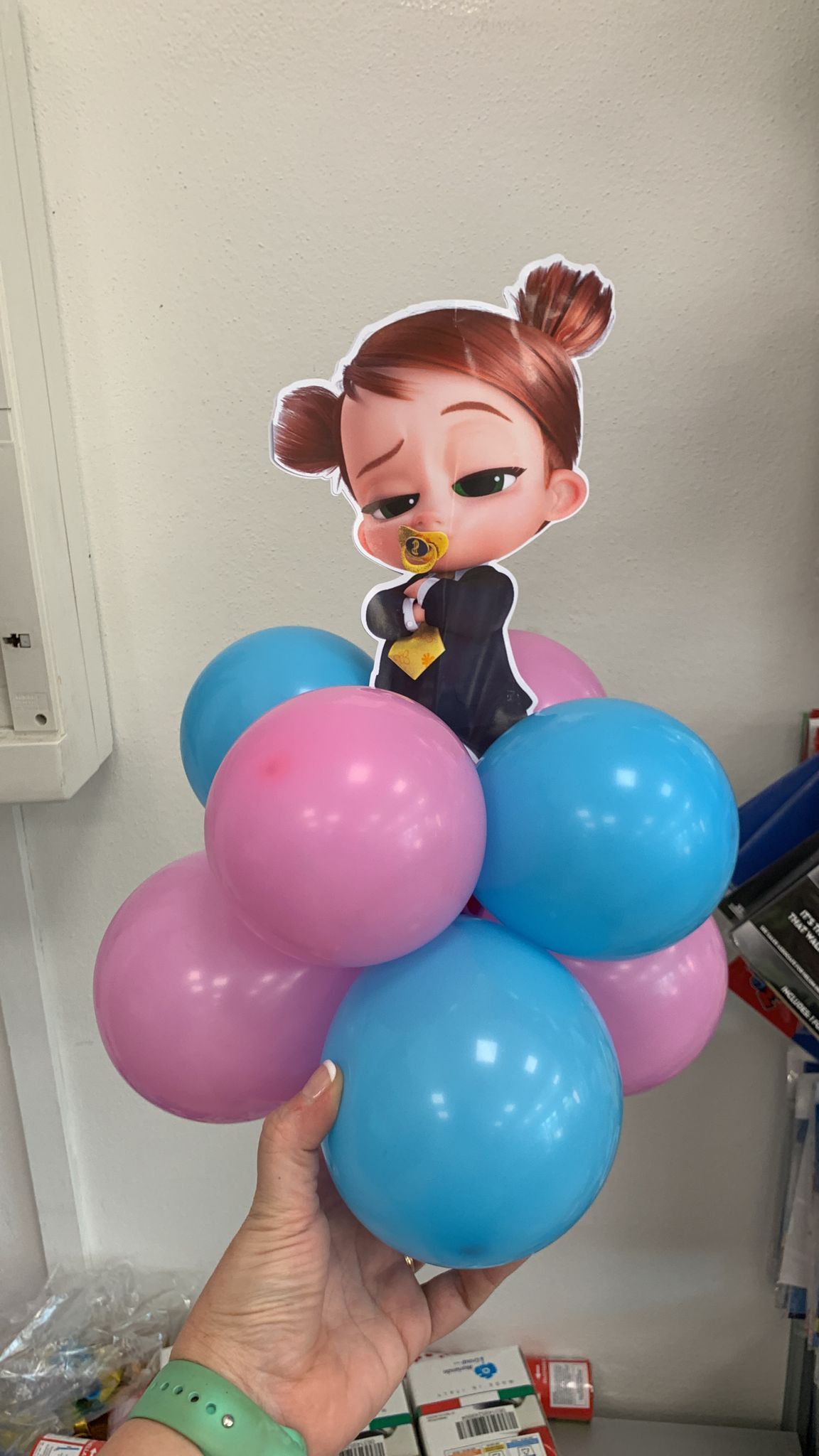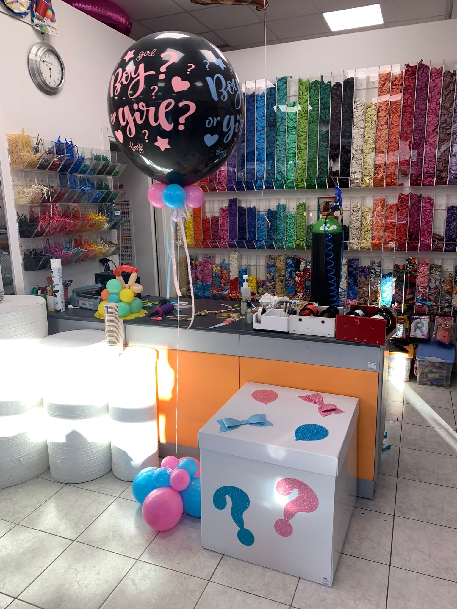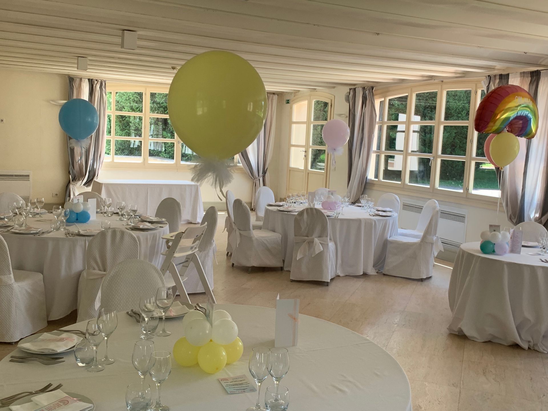 Oltre ai palloncini classici di ogni colore e con varie stampe possiamo proporti forme speciali come neonato, cicogna, biberon, ciuccio ecc; comporre il nome con lettere piccole e giganti, realizzare centrotavola, archi o composizioni di palloncini per